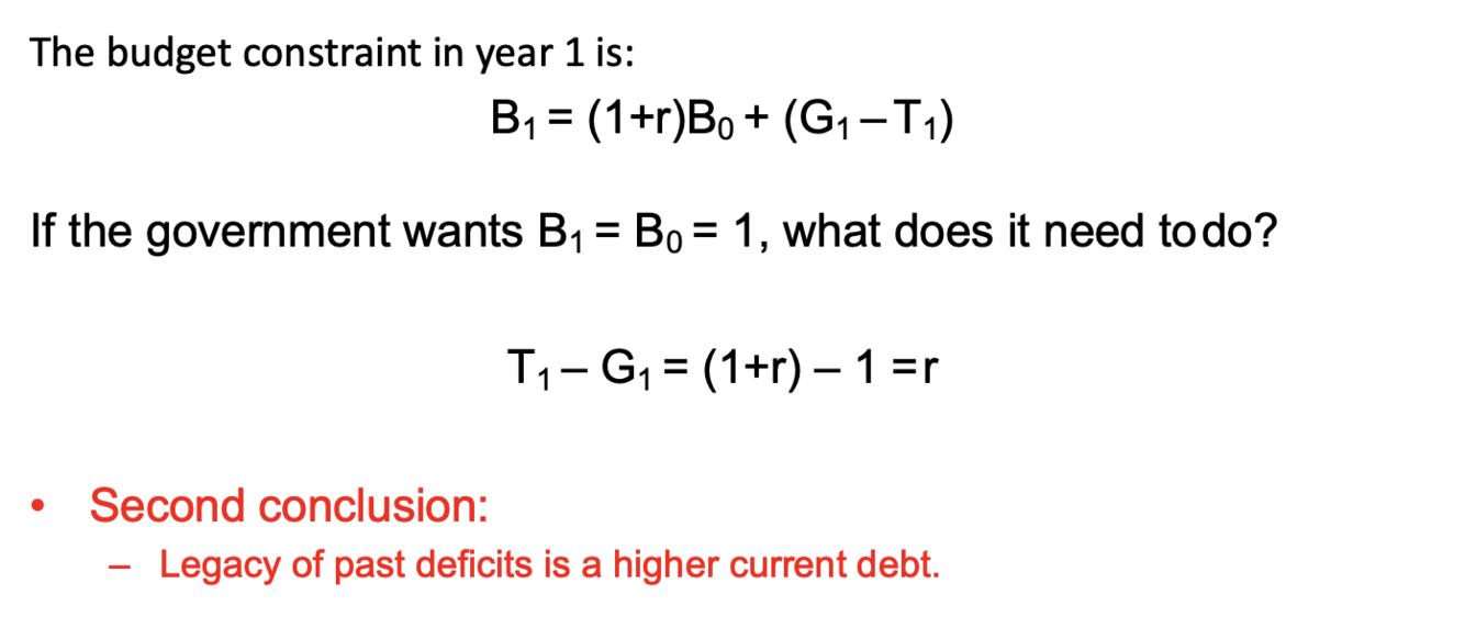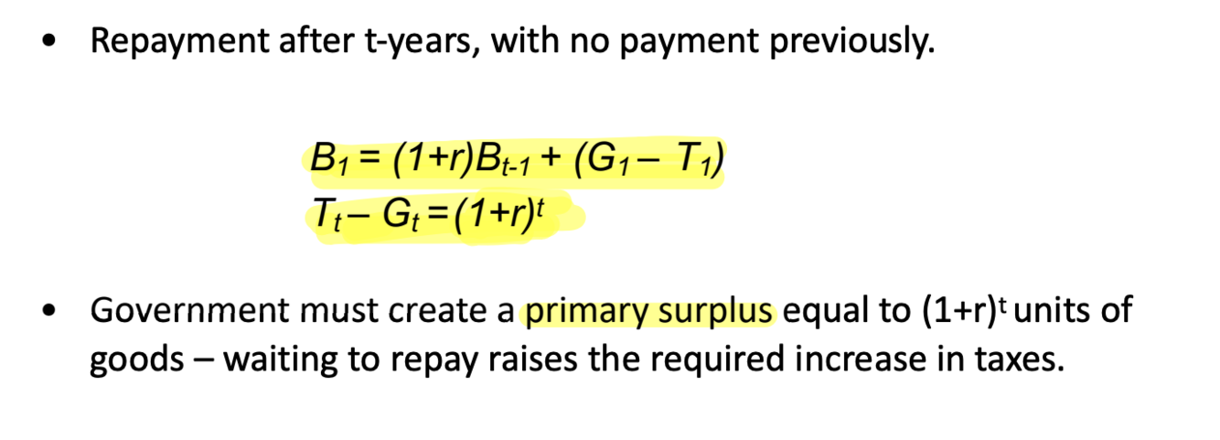 -To stabilise debt, government must achieve a primary surplus equivalent to the real interest on existing debt, r, and must do this in every subsequent year