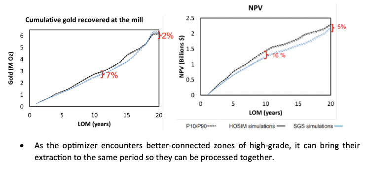 This paper investigates the benefits of simultaneously optimizing a mining complex where the simulations of the mineral deposit are generated by a high-order, direct-block simulation approach. The optimized life-of-mine (LOM) production schedule is compared to a case in which the same setting is optimized by having the related simulations generated using a second-order simulation method.