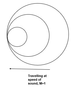 pressure waves radiate from the body in concentric circles when the body moves, the pressure waves infront of the body are closer together and the waves velocity relative to the body of a-V pressure waves behind the body are further apart and the waves velocity relative to the body of a+V