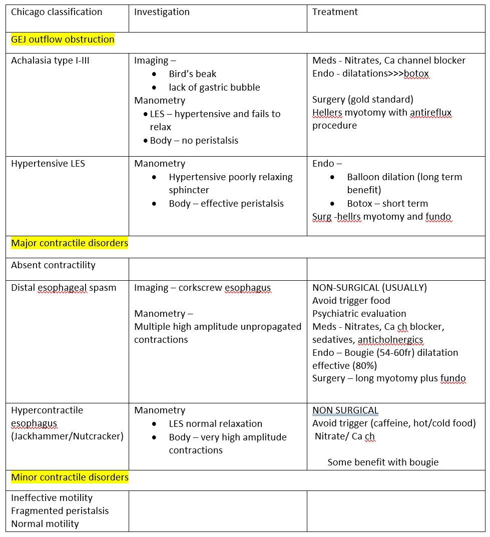 How are esophageal motility disorders classified, what are the manometric/ imaging abnormalities and what are the treatment options