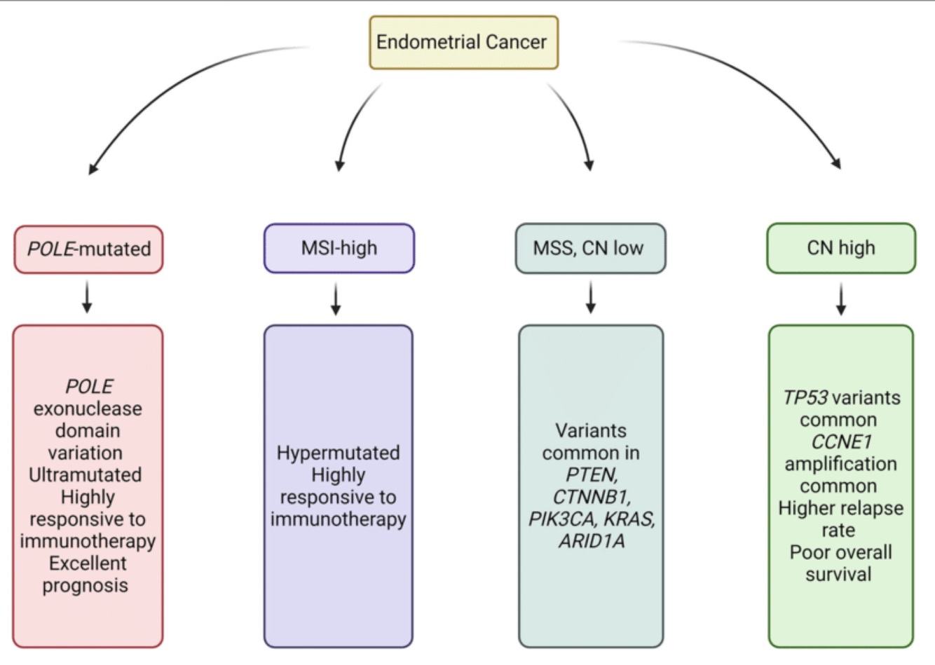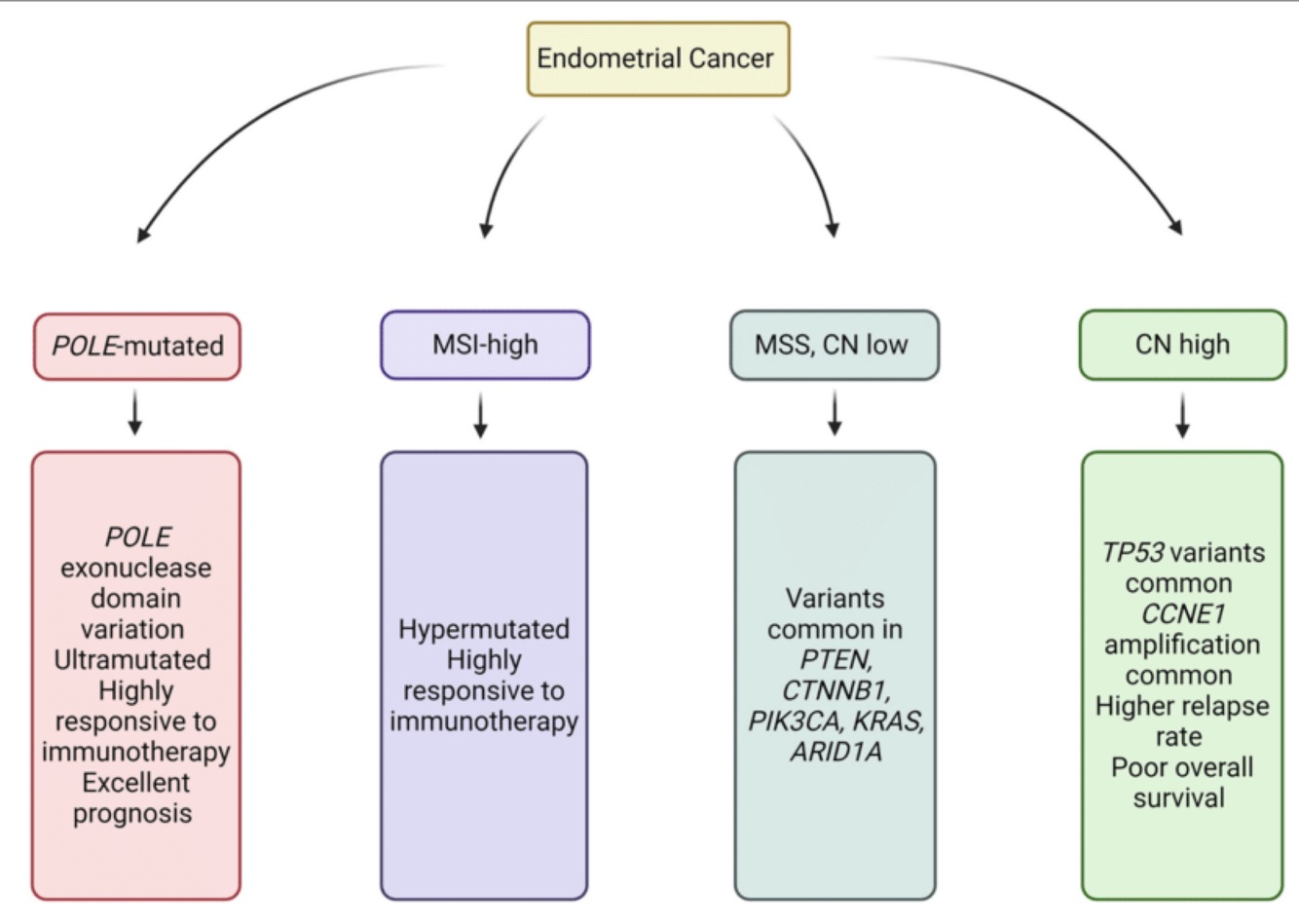 excellent prognosis regardless of grade POLE (why? high tumor mutation burden, tumor neoantigen production, and tumor infiltrating T cells)