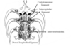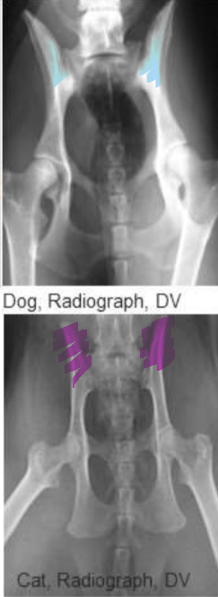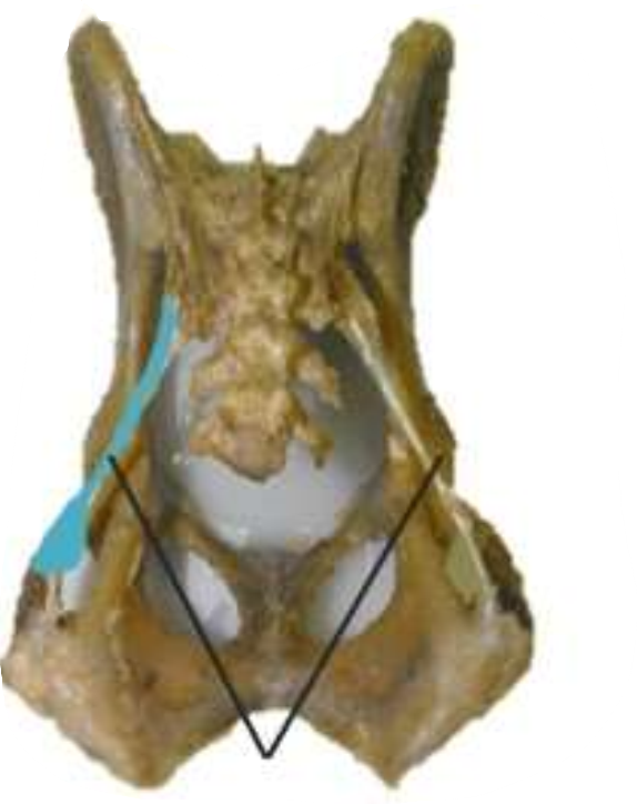 2 ossa coxae (L + R) fused w cartilagenous joint @ centre, each made up 4 flat bones: