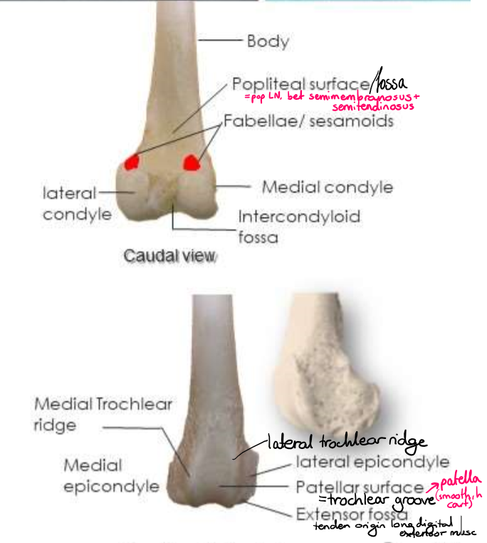 condyles = smooth + covered cartilage -> tibia (stifle)