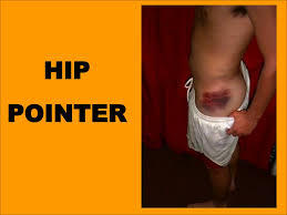 a contusion of the iliac crest and/or the greater trochanteric region of the femur following a direct impact or collision or potentionally the abdominal wall
