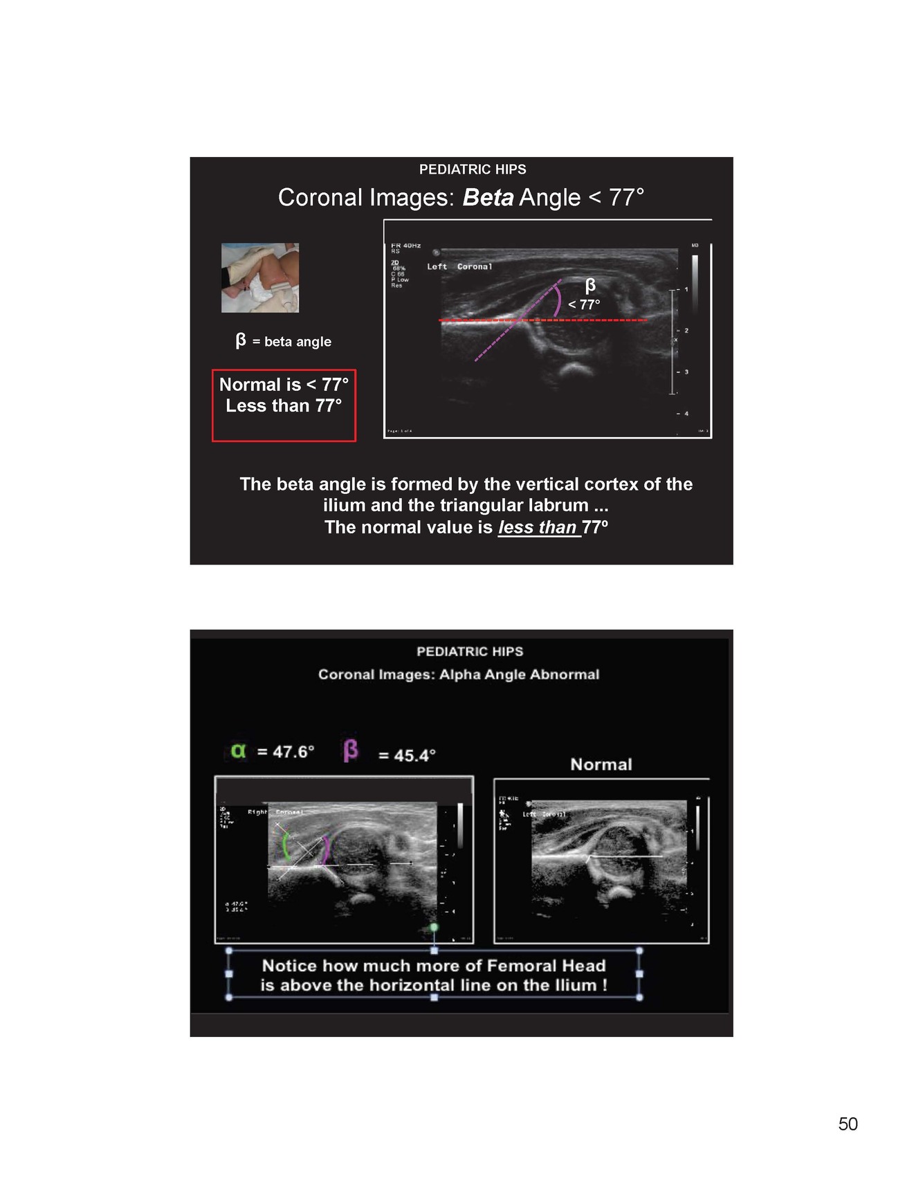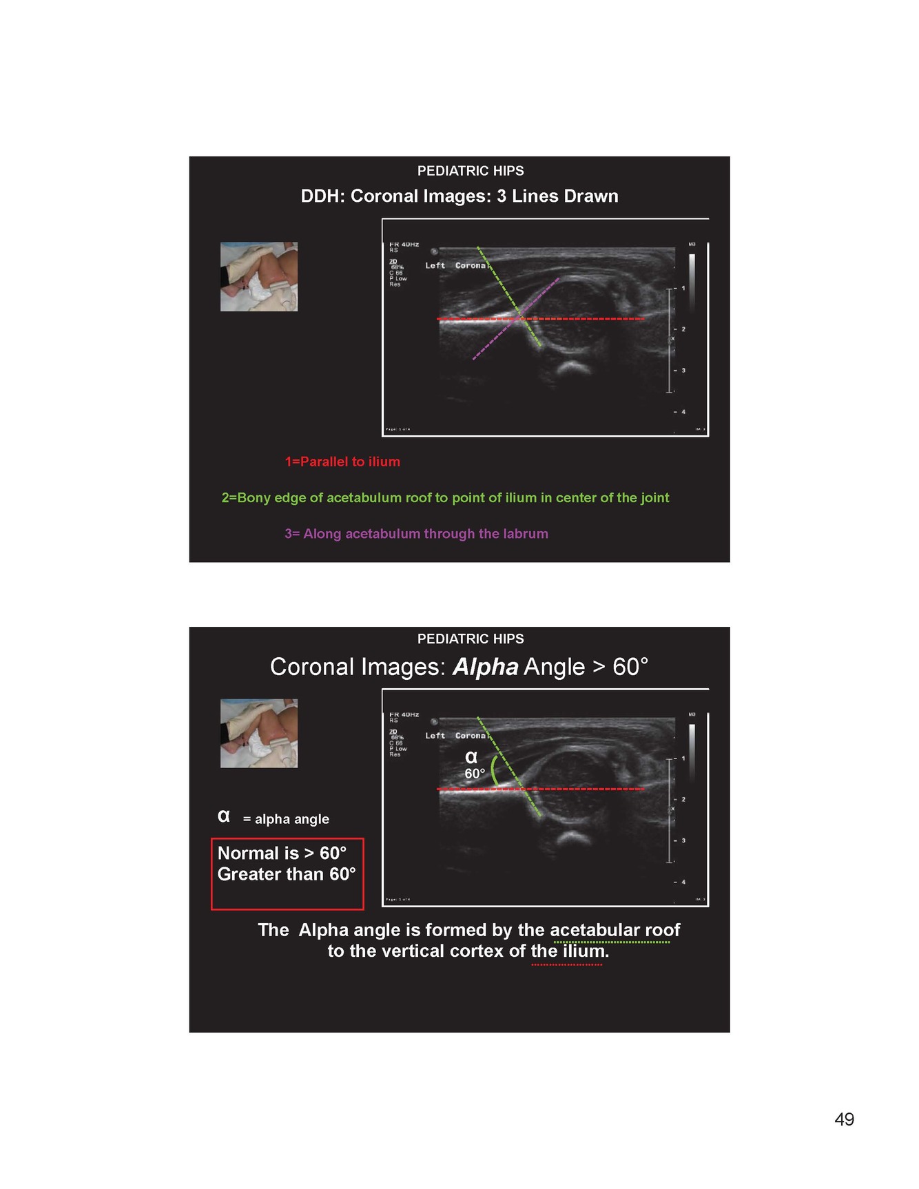 What is a normal alpha angle for a pediatric patient?