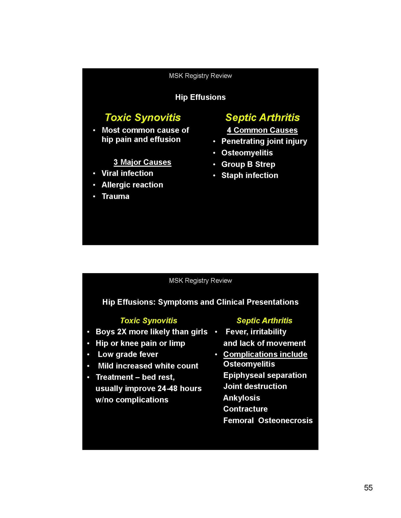 What is the difference between pediatric hip toxic synovitis and septic arthritis?