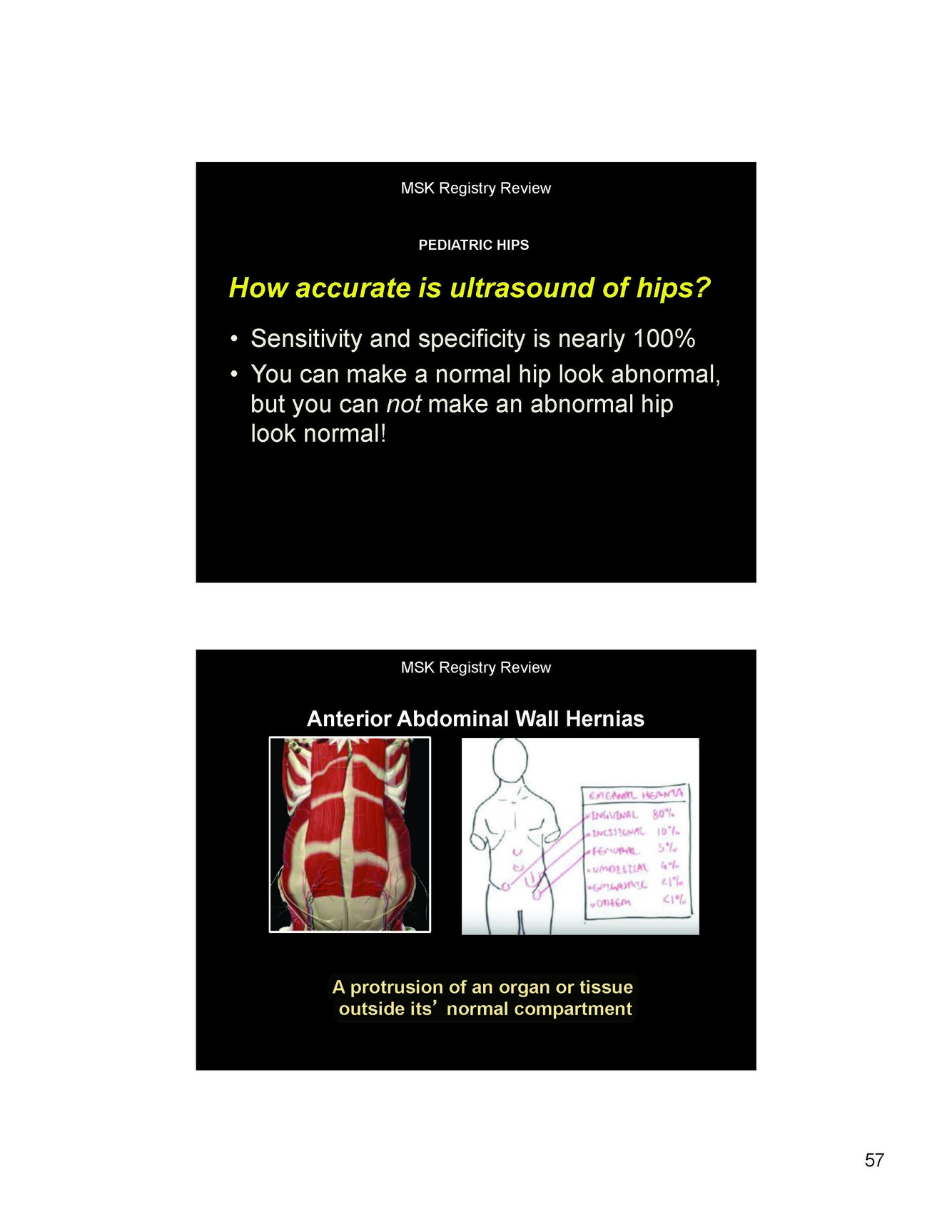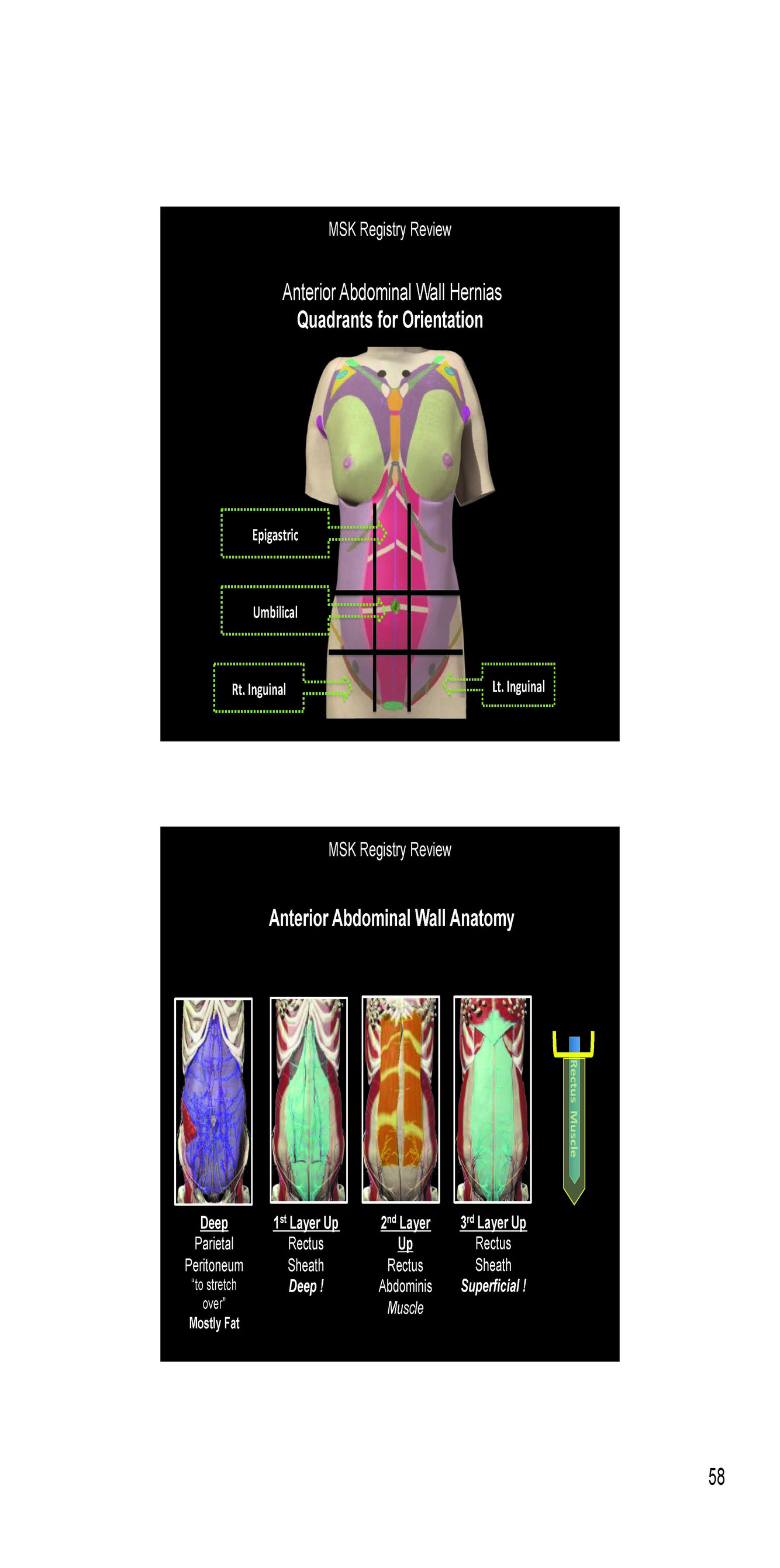 Name the 3 quadrants for the orientation of a hernia
