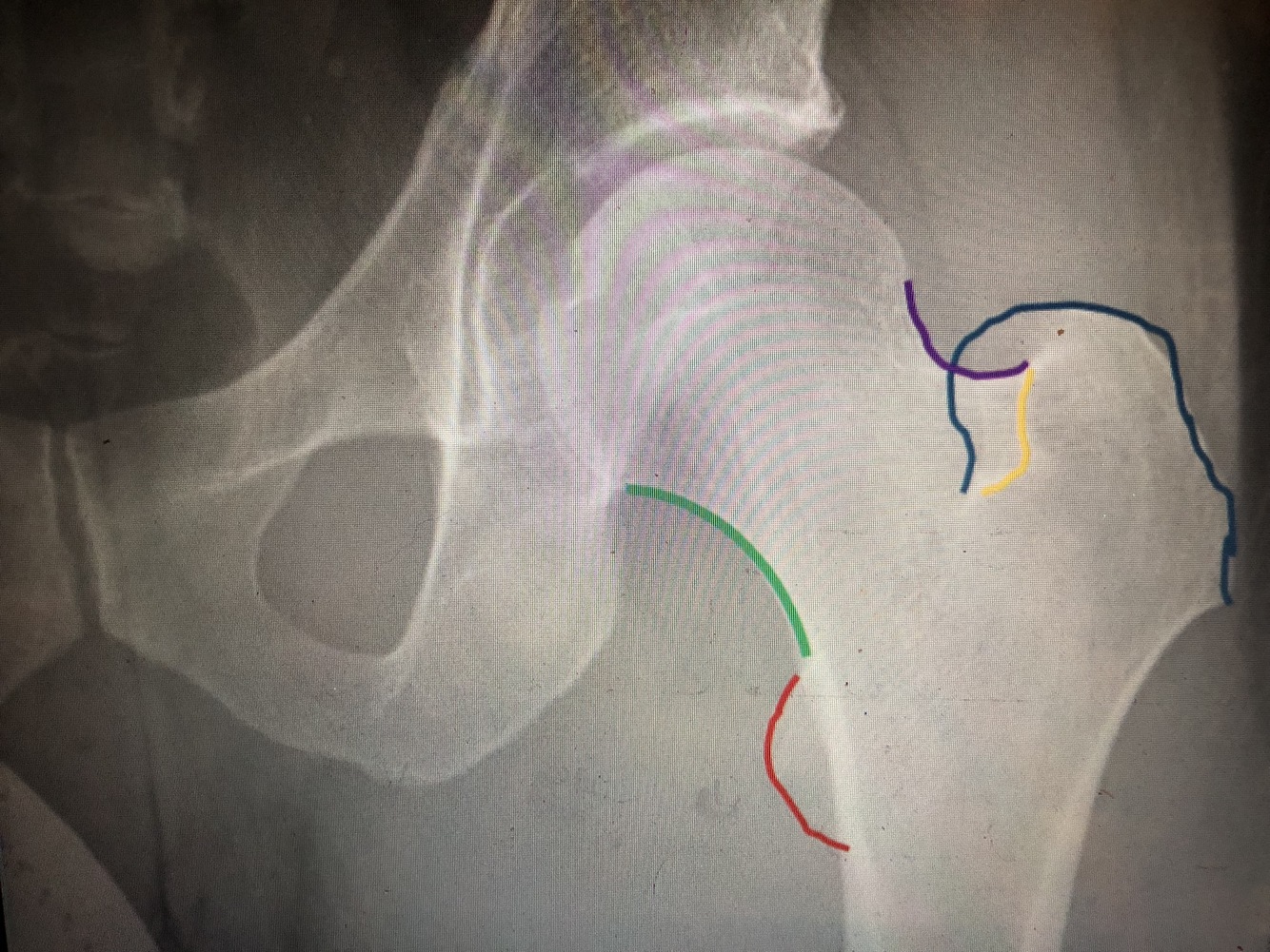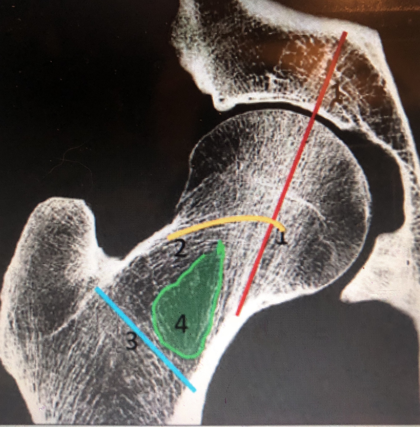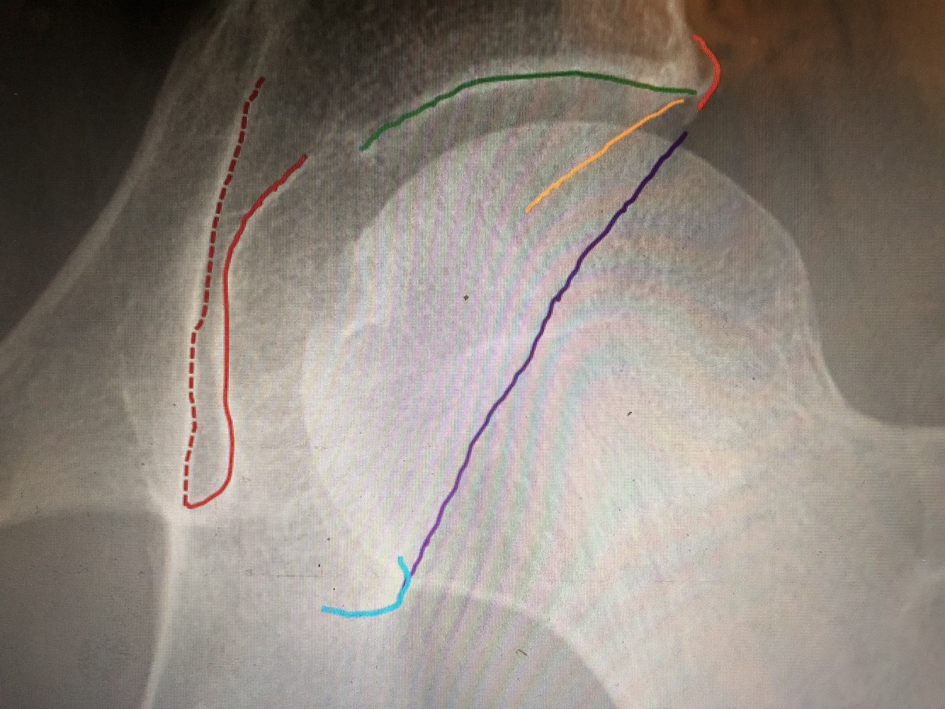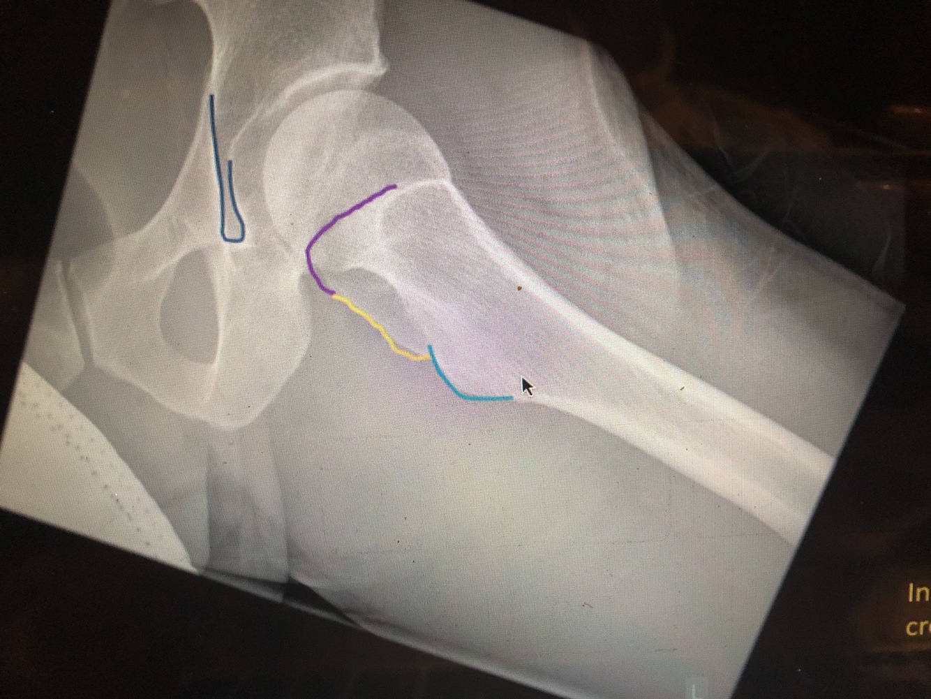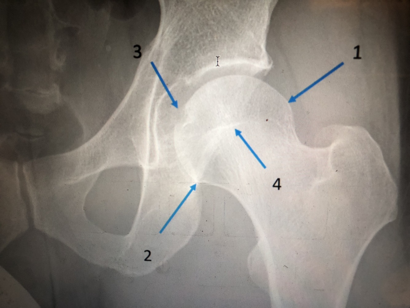 The anterior rim of the acetabulum is more medial. (not completely seen)