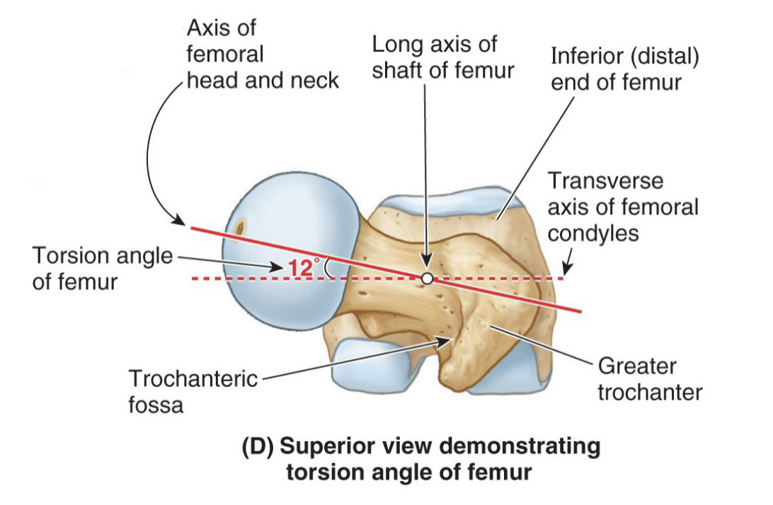 The torsion angle of the femur refers to the degree of rotation or twist along the long axis of the femur bone. It indicates the orientation of the femoral neck and head in relation to the femoral condyles at the knee.