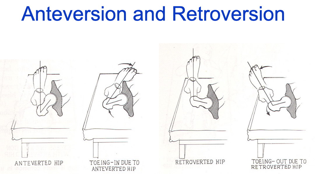 Anteversion means that the femoral neck and head are rotated forward in relation to the condyles, creating a slight twist. Retroversion, on the other hand, would indicate a backward rotation.