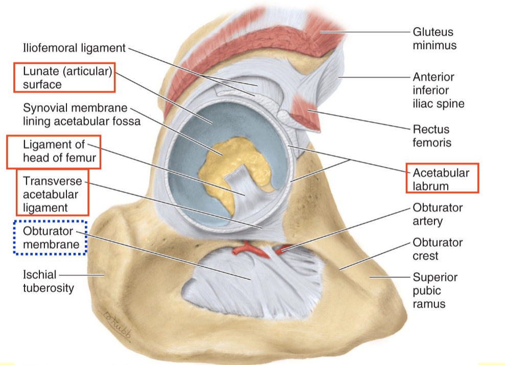 The acetabular labrum is a ring of fibrocartilage that runs around the outer rim of the acetabulum.