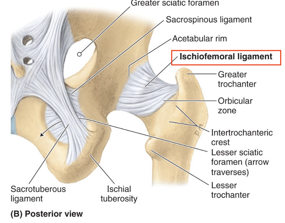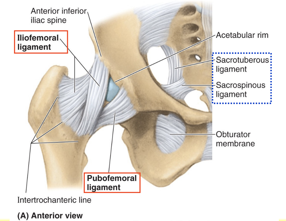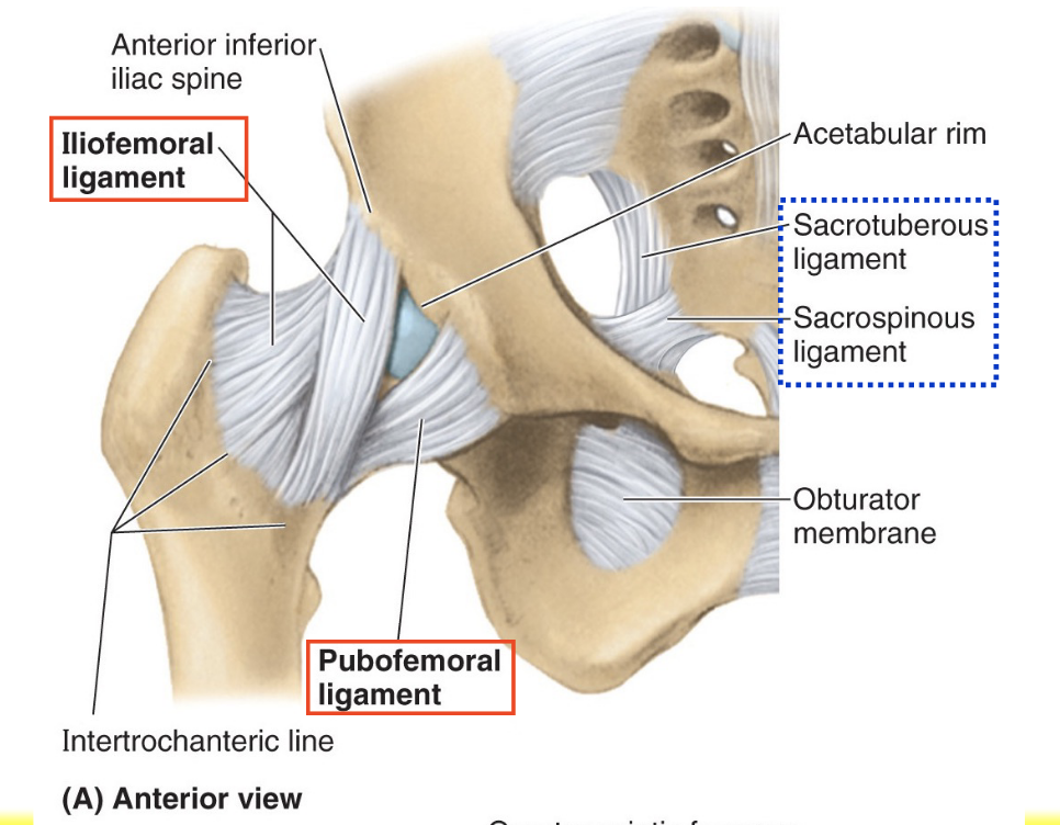 This is the strongest of the three ligaments and forms a Y-shaped structure. It runs from the anterior inferior iliac spine (AIIS) and the acetabular rim to the intertrochanteric line on the femur.