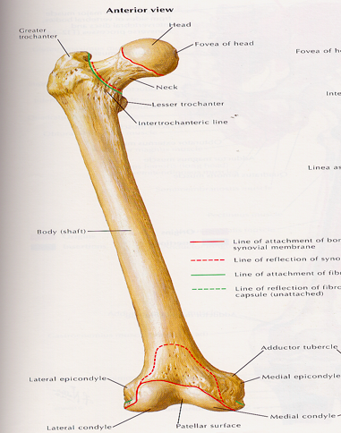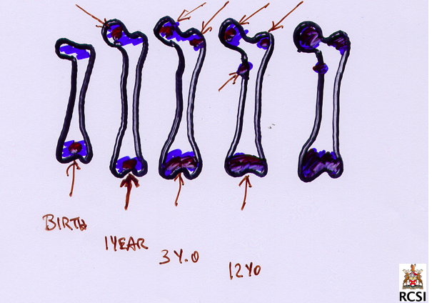 lesser trochanter = appears at 12 years old (fusion at 18)