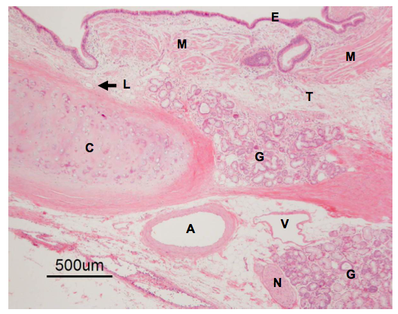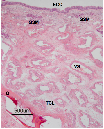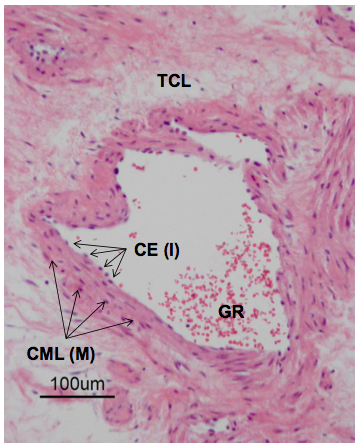 Les vaisseaux de la lamina propria sont entourés de tissu conjonctif lâche (TCL). Leur lumière contient des globules rouges (GR). Ces vaisseaux ont une couche interne, l’intima (I), qui est recouverte de cellules endothéliales (CE). Ils ont aussi une paroi, la media (M), qui est constituée de cellules musculaires lisses (CML).