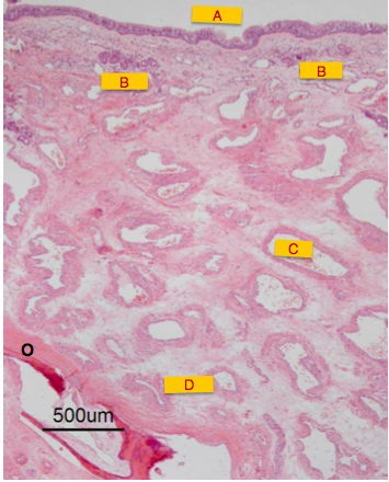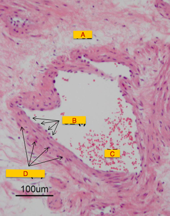 D : Paroi, la média (M) qui est constituée de cellules musculaires lisses (CML)