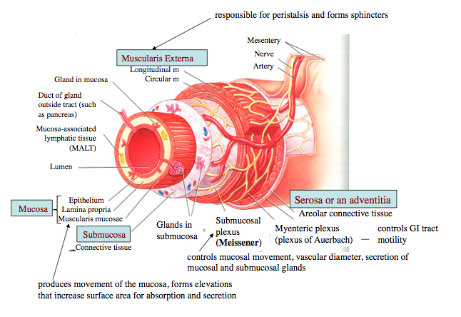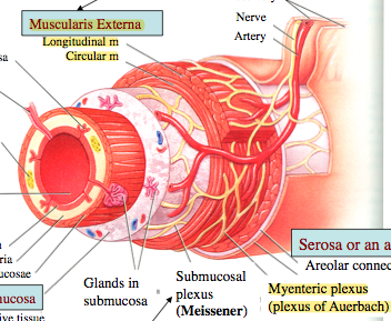 Inner circular muscle layer, outer longitudinal muscular layer, and the myenteric plexus (plexus of Auerbach) in between