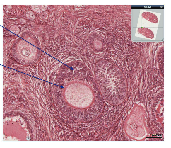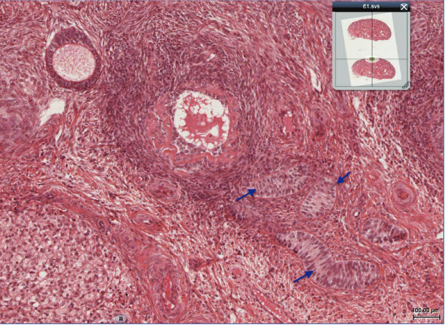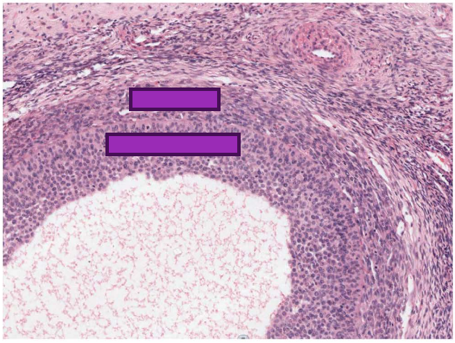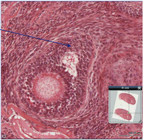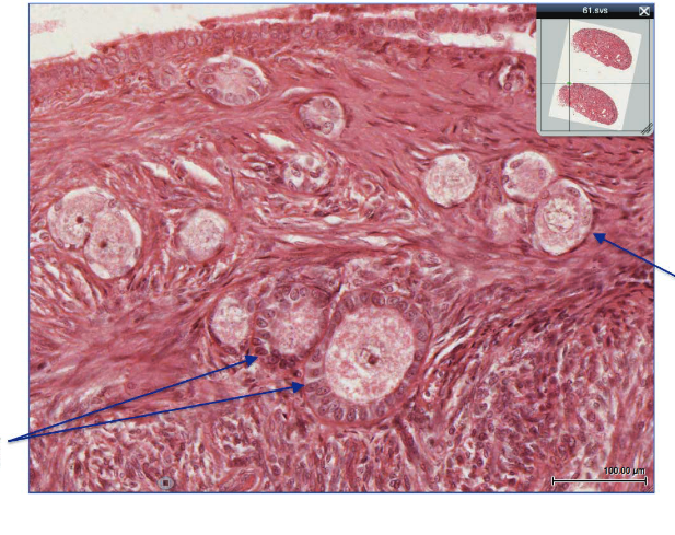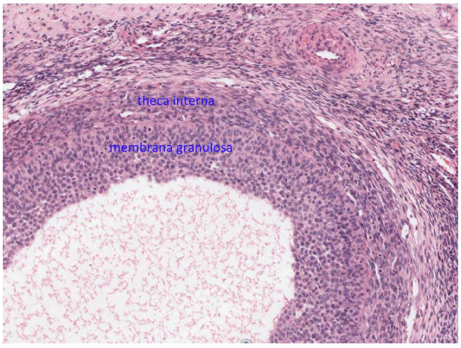 ** they may undergo hypertrophy, luteinization, fibrosis, or hyalinisation– which the theca interna and basement membrane may become amorphous and resemble a glassy structure.