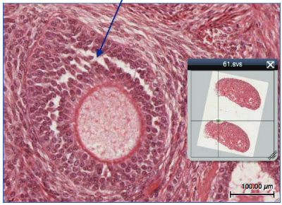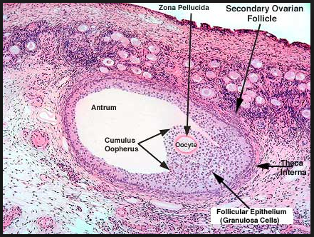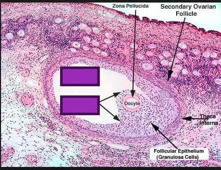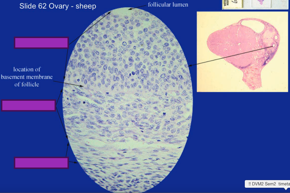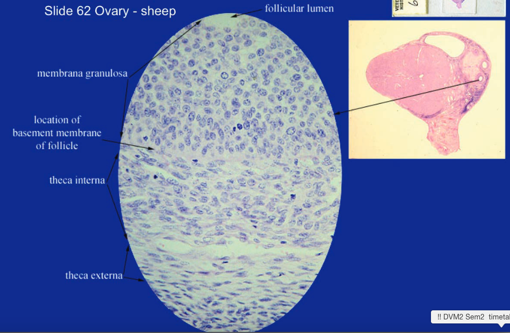 The membrana ganulosa cells possess FSH receptors and in late tertiary follicles, LH receptors. The endocrine cells of the theca interna possess LH receptors. LH acts on the endocrine cells of the theca interna to facilitate PRODUCTION OF ANDROGENS. Then passes to the membrana granulosa to produce oestrogens under the influence of FSH. Causing signs of oestrus.