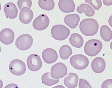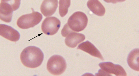 Howell-jolly bodies- seen in sickle cell anemia with a functional hyposplenia