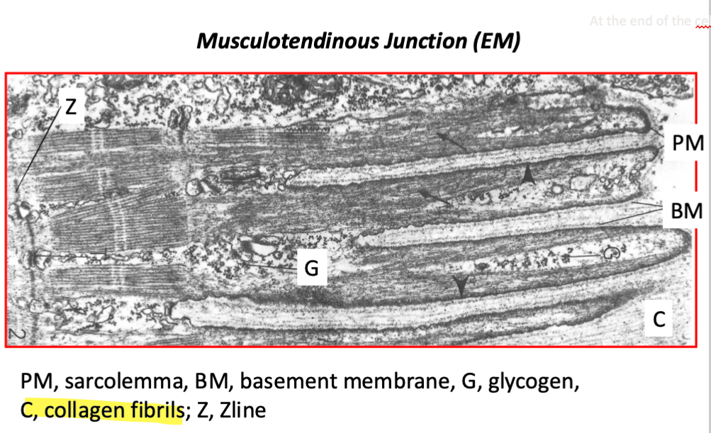 they contain finger like projections made of actin (inside the muscular fiber) and the basement membrane (on the outside of the plasma membrane) that attaches to the collagen fibers of the tendon