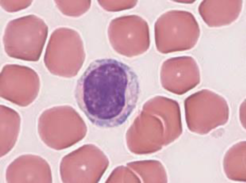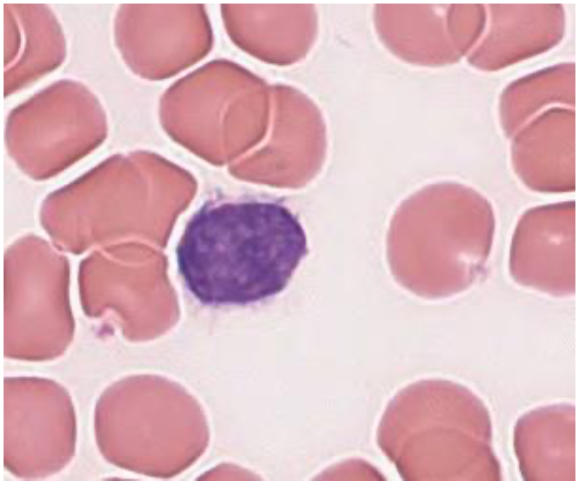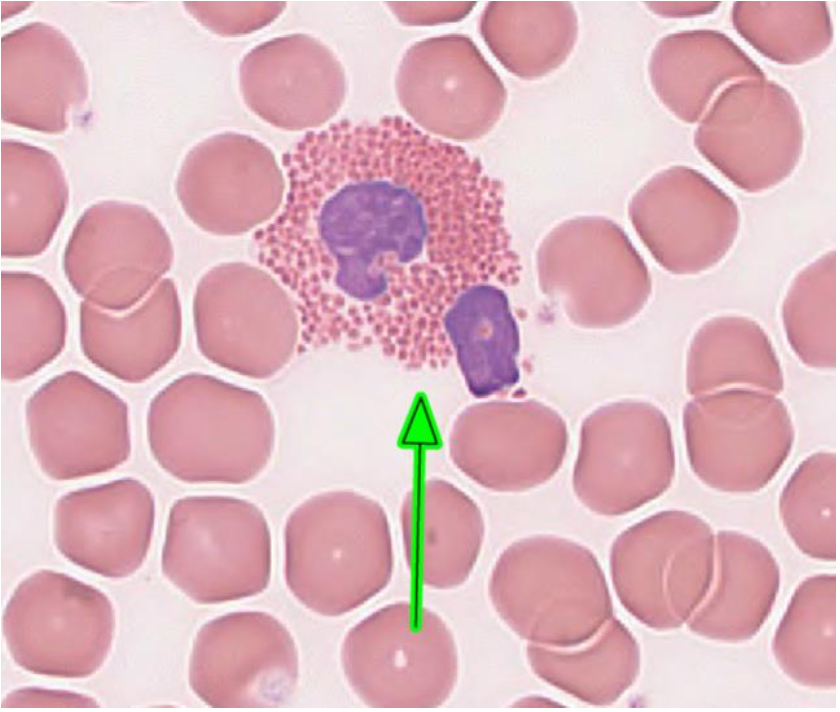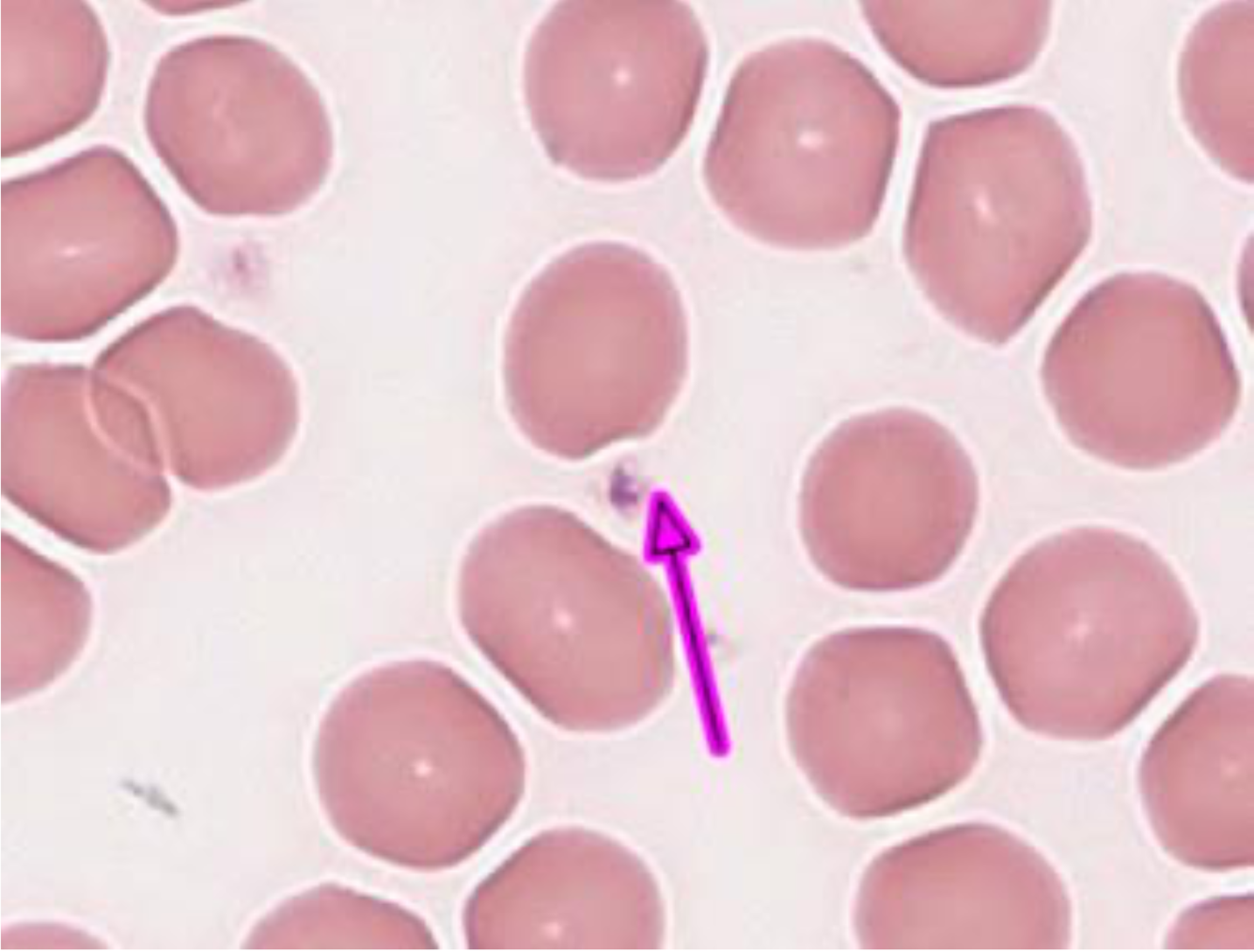 The RBCs are smaller and have a larger central pallor, with the staining presenting mainly on the outline of the cell. The shape is consistent.