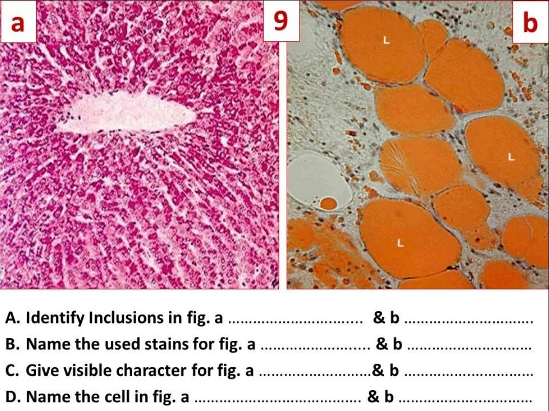 A. Inclusions in fig. a → Glycogen & b lipid OR fat.