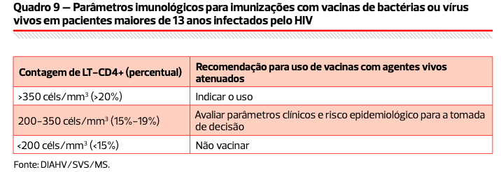 Parâmetros imunológicos para imunizações com vacinas de bactérias ou vírus vivos em pacientes maiores de 13 anos infectados pelo HIV