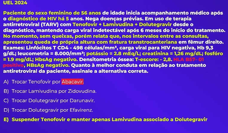 resumão de efeitos colaterais, pensando no tenofovir as provas podem cobrar a diminuição de massa óssea pela hipofosfetemia e desmineralização porêm essa questão demonstra um outro conhecimento o de que com HLA positivo você tem a hipersensibilidade ao Abacavir e com isso não pode trocar o tenofovir por ele e te apresenta uma nova possibilidade