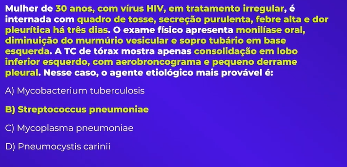 colocando um quadro clínico florido do ponto de vista pulmonar pois pneumocistose não faz quadro pulmonar florido + um paciente hiv sucetível. não achar que é pneumocistose só porque tem hiv