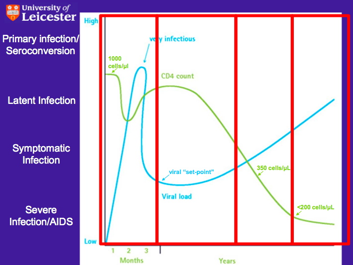 BUT, virus then slowly increases and CD4 count decreases. (Below 500, start to notice symptoms)