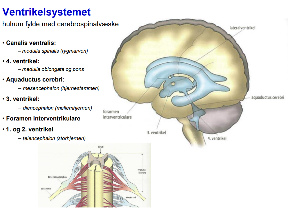 Ventrikelsystemet består af to laterale ventrikler, samt tredje og fjerde ventrikel. I ventrikelsystemet sker en løbende produktion, cirkulation og genabsorbering af rygmarvsvæske. Rygmarvsvæsken beskytter ved slag mod hovedet og er afgørende for at opretholde kemisk stabilitet og tilførsel af næringsstoffer til hjernen.