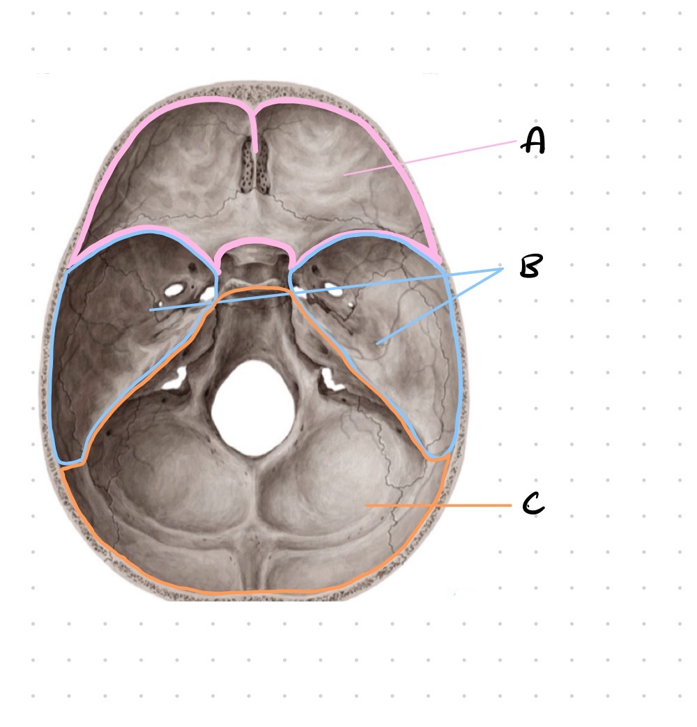 C- Superior orbital fissure- opthalmic division of trigeminal nerve, occularmotor nerve, trochlear nerve, abducent neve, superior opthalmic vein (CN V1, 3, 4, 6)