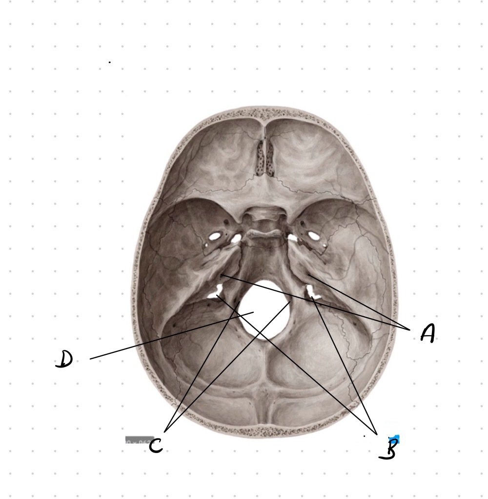 A- Internal acoustic meatus- cranial nerves 7 and 8 pass through here