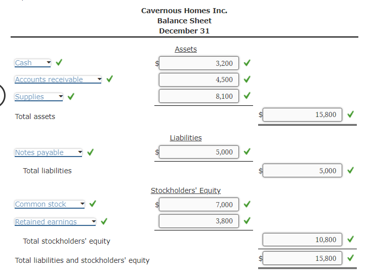 An analysis of the transactions of Cavernous Homes Inc. yields the following totals at December 31: cash, $3,200; accounts receivable, $4,500; notes payable, $5,000; supplies, $8,100; common stock, $7,000; and retained earnings, $3,800.
