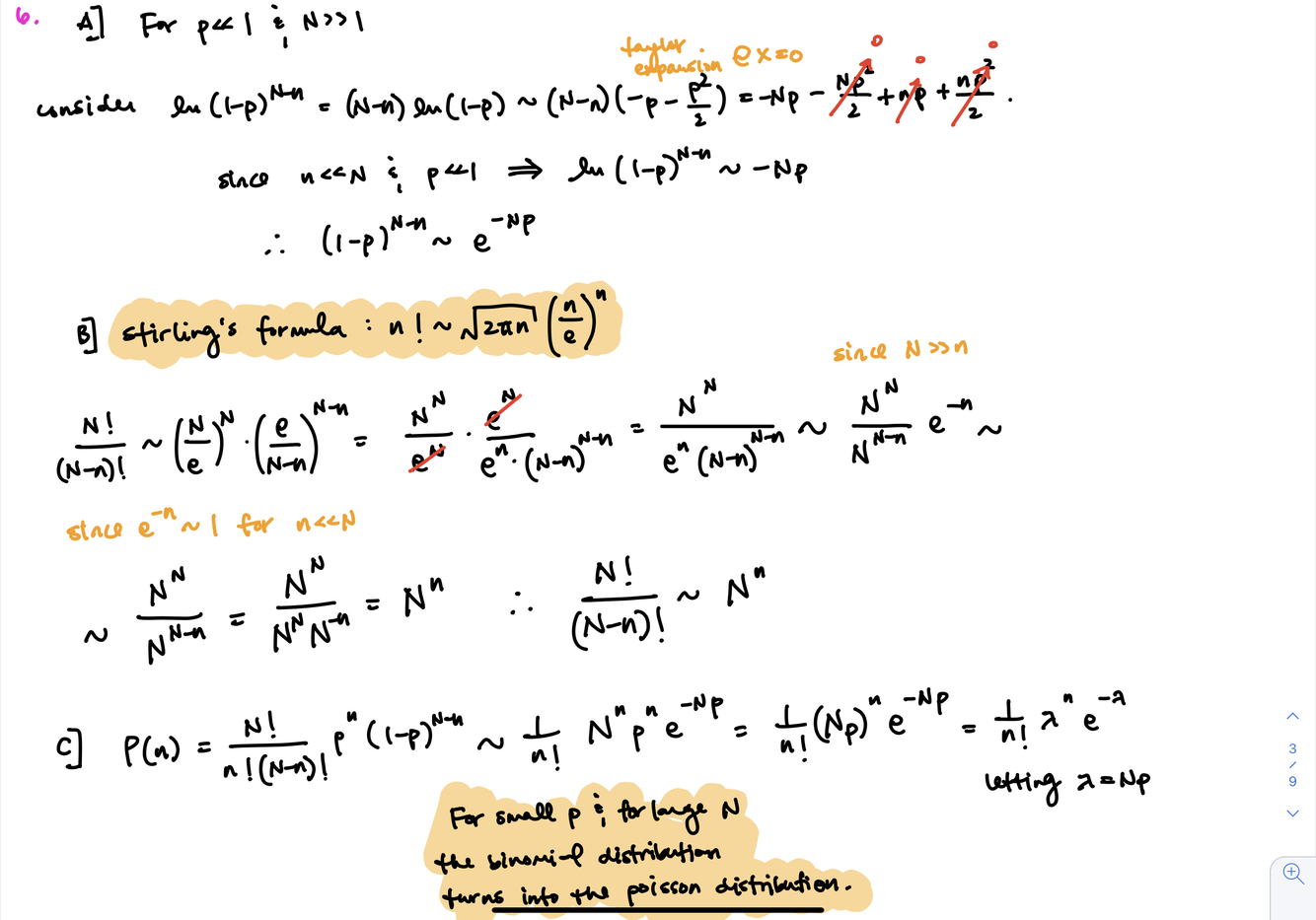 (c) Therefore, you can show that P(n) = (λn / n!) e-λ where λ = Np. You have just demonstrated that the binomial distribution for small p and large N turns into the Poisson distribution!