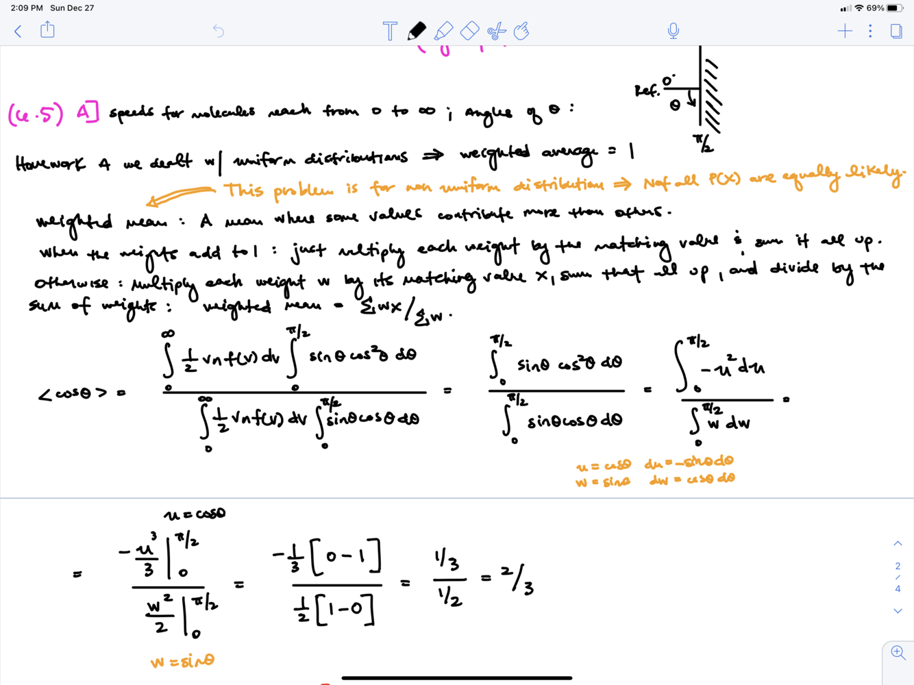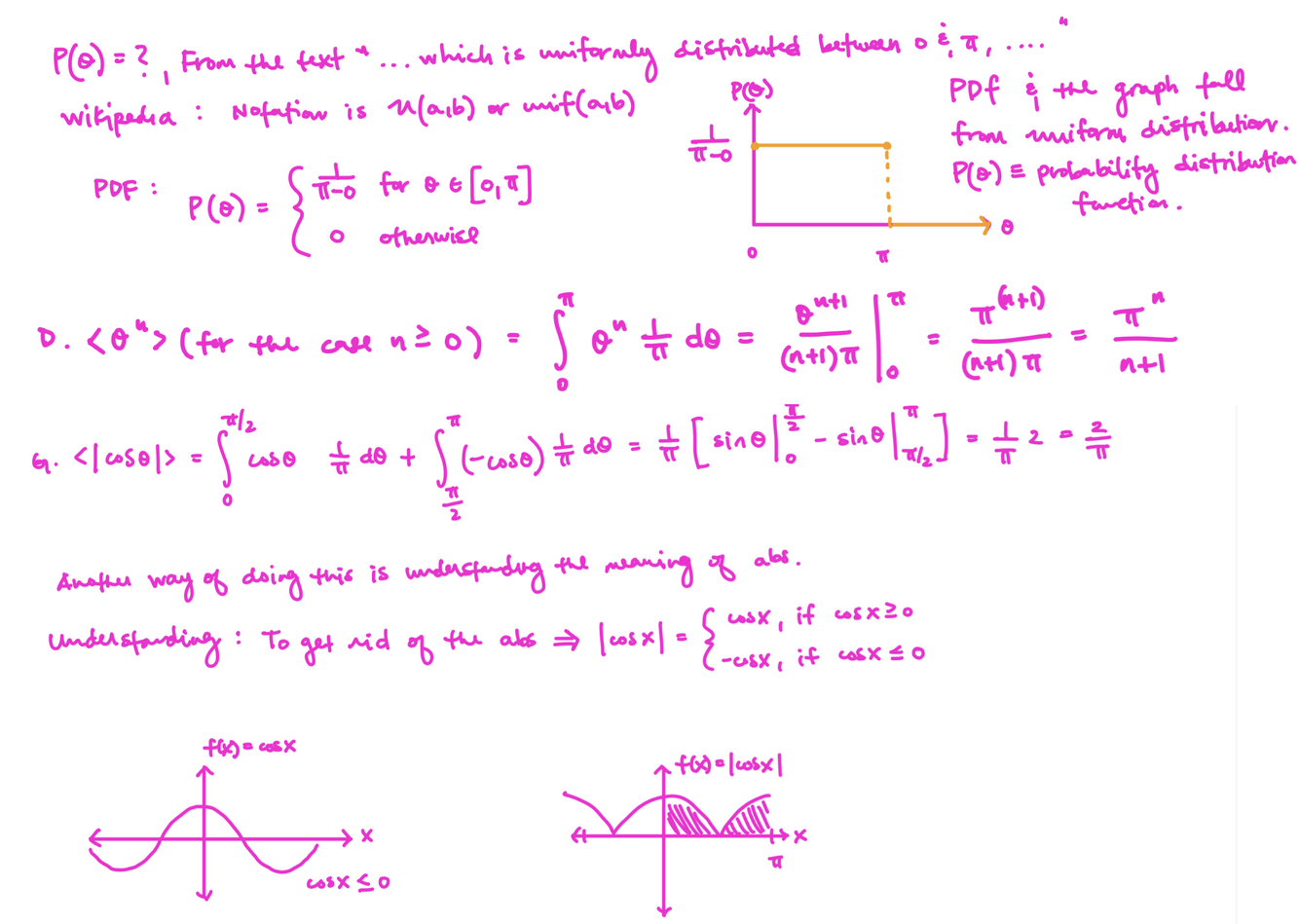 If θ is a continuous random variable which is uniformly distributed between 0 and π, write down anexpression for P(θ). Hence find the value of the following averages: