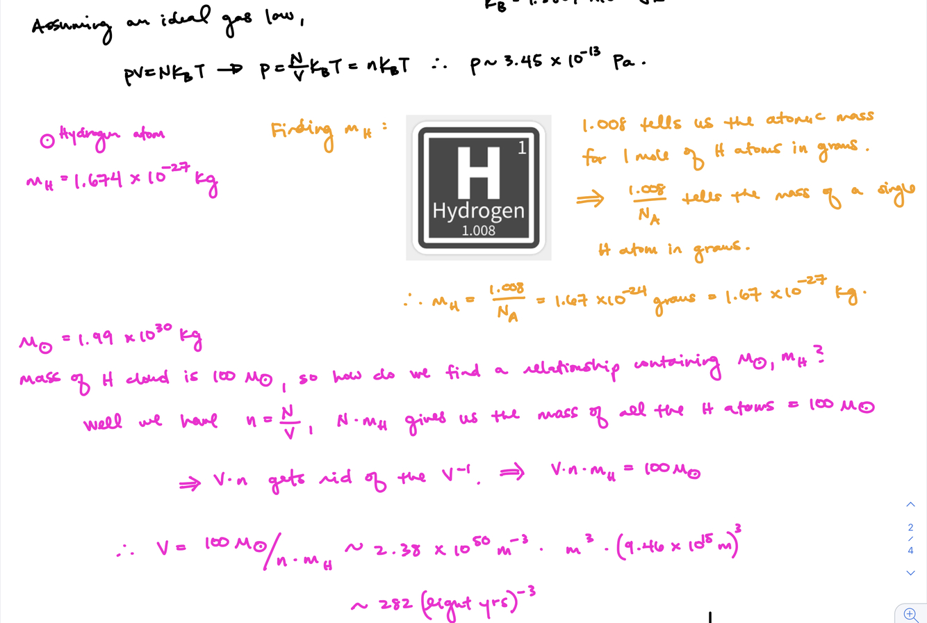 A diffuse cloud of neutral hydrogen atoms (known as HI) in space has a temperature of 50K and number density 500 cm-3. Calculate the pressure (in Pa) and the volume (in cubic light yrs) occupied by the cloud if its mass is 100Msun.