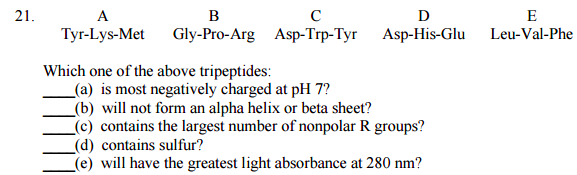 Q # 21 Which one of the above tripeptides: (a) is most negatively charged at pH 7? (b) will not form an alpha helix or beta sheet? (c) contains the largest number of nonpolar R groups? (d) contains sulfur? (e) will have the greatest light absorbance at 280 nm?