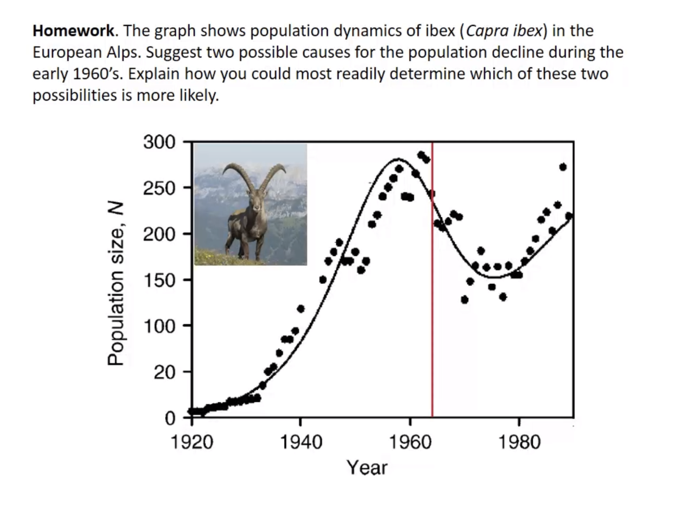(Depletion of prefered food caused by over population of ibex now they’re struggaling to find enough to stay healthy and fertile. reproductive rate has fallen and survival of adults are threatended)