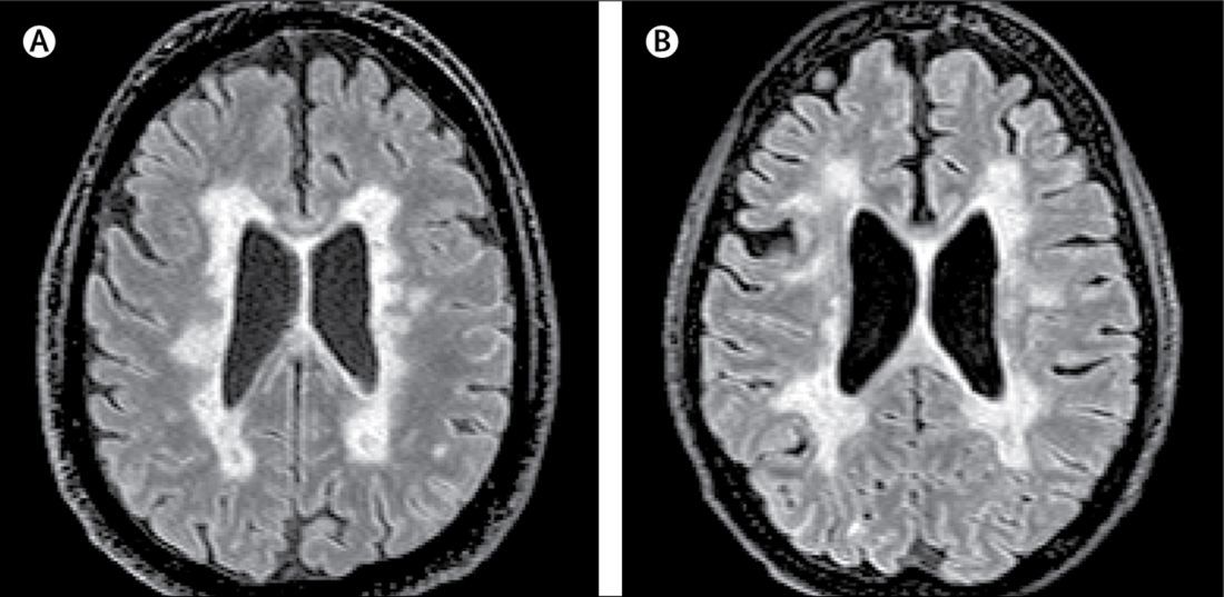 What are the typical diagnostic features seen with an MRI of the head and CT of the spine in a patient with MS?