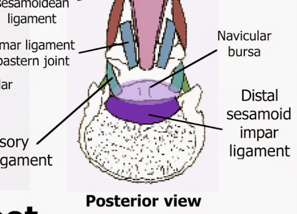 Proximal sesamoid bones, the common digital extensor tendon, and the distal sesamoidean ligaments.