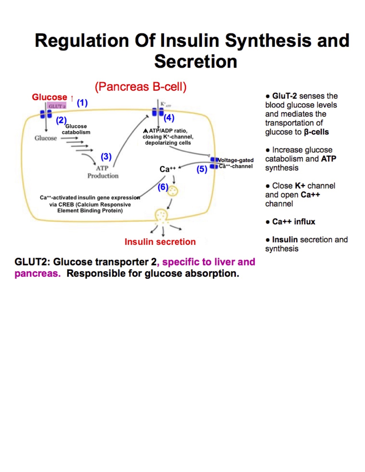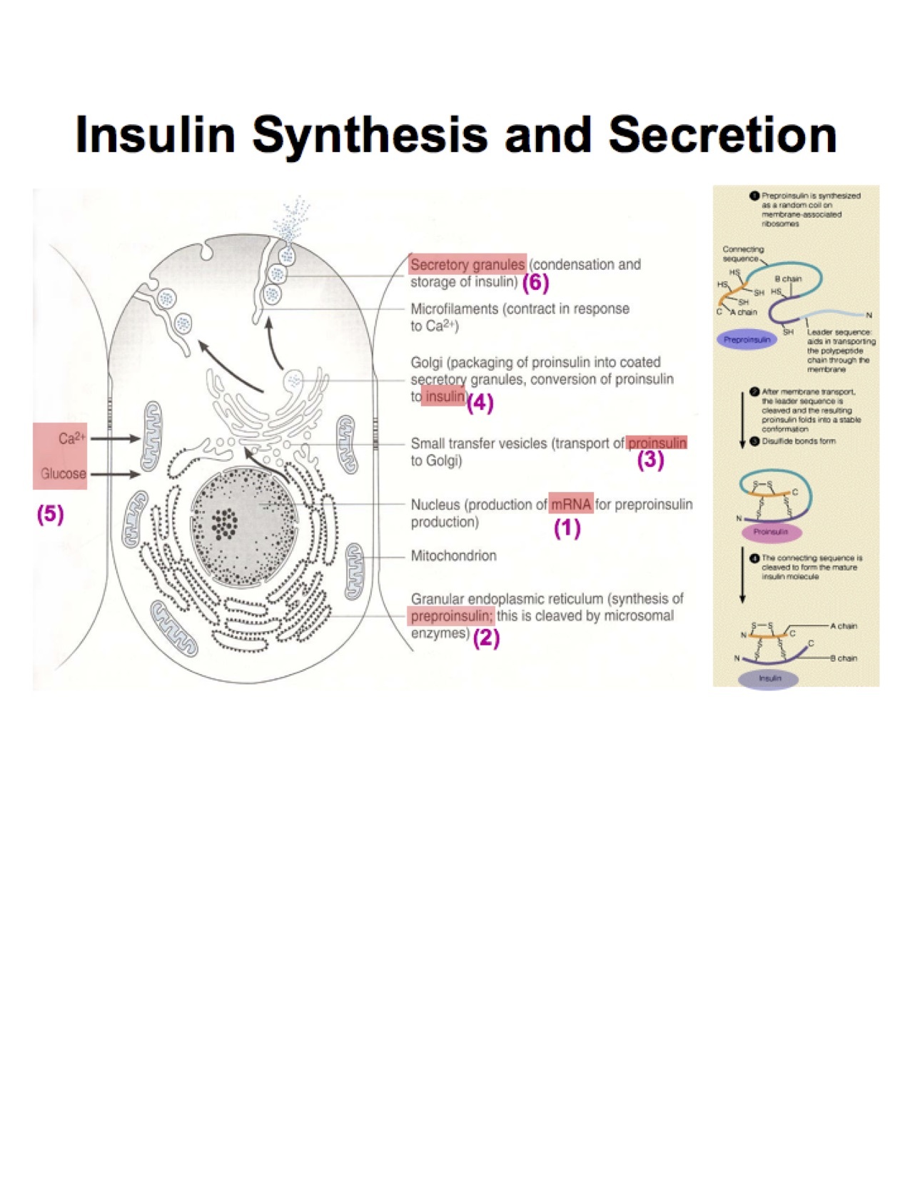 Steps of insulin synthesis and secretion in beta cells? (8)