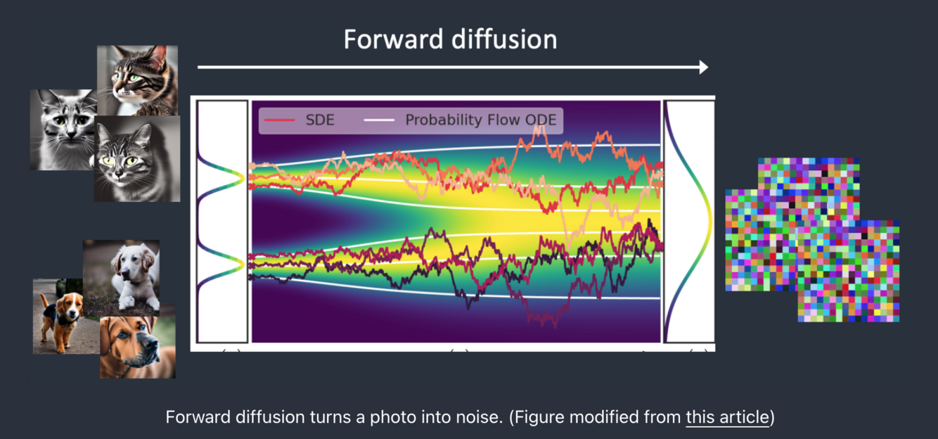 The forward process will turn any cat or dog image into a noise image.