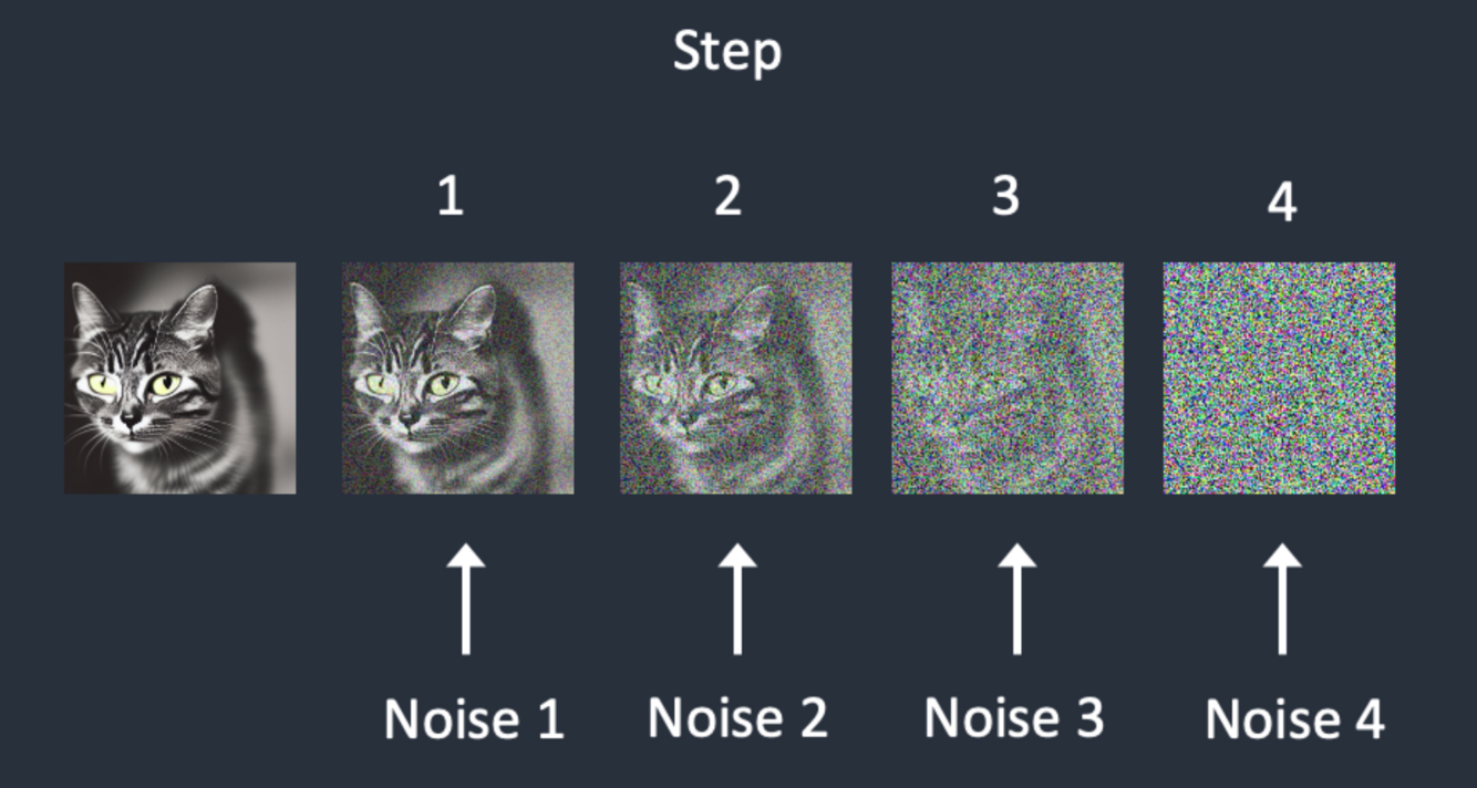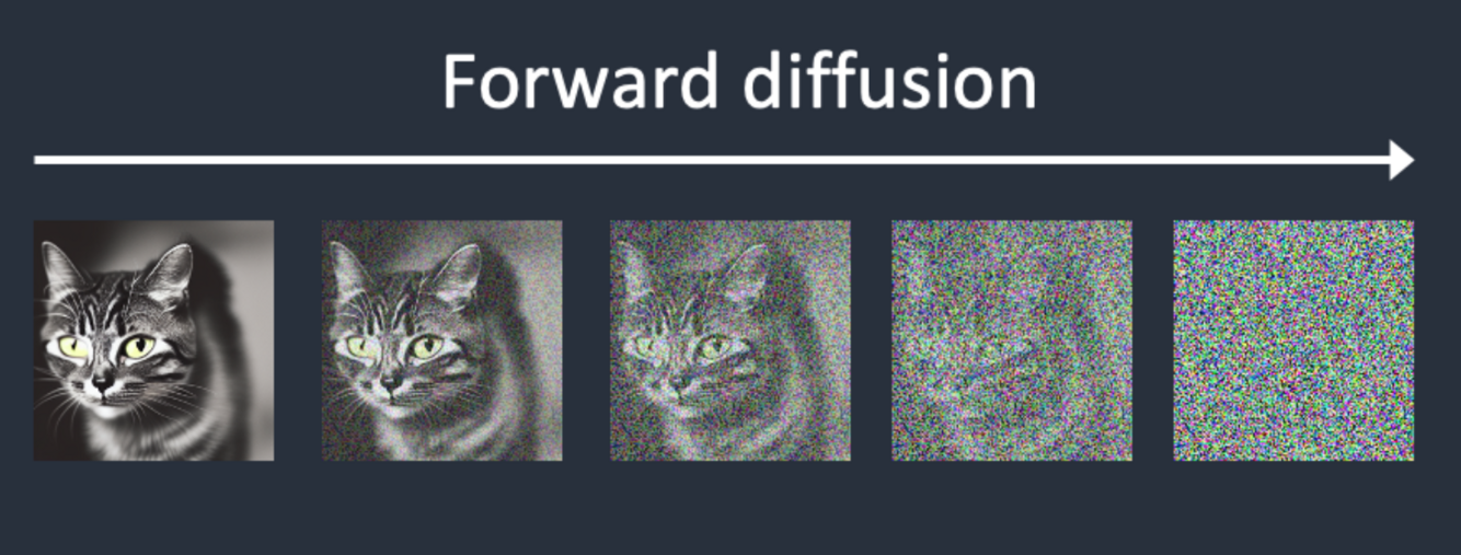 A forward diffusion process adds noise to a training image, gradually turning it into an uncharacteristic noise image.