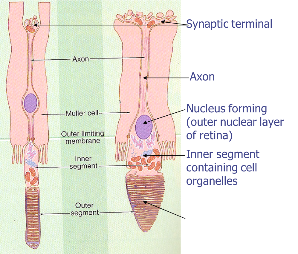 The outer segment of a rod or a cone contains the photosensitive chemicals: