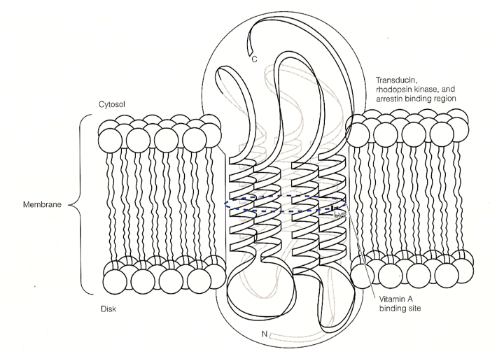 ultimatley leading to a Na+ channel in the cell membrane to close and when this closes this causes hyperpolarisation and by the time it reaches the optic nerve it becomes depolarisation and this is the action potential which is taken to the brain to see the outside world