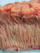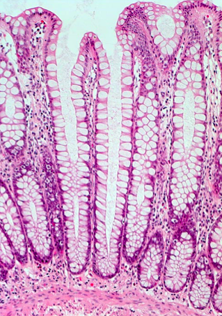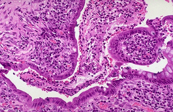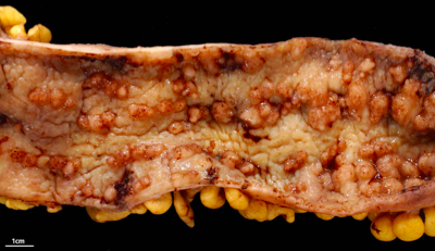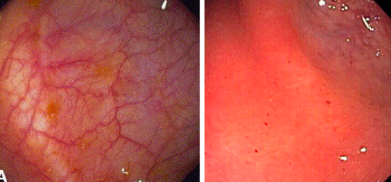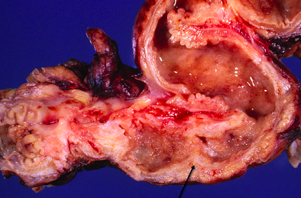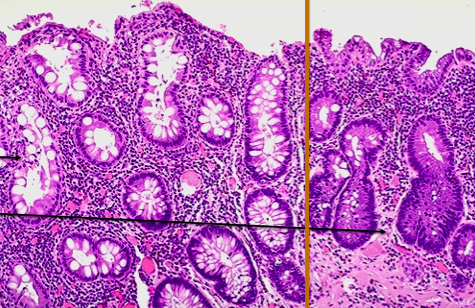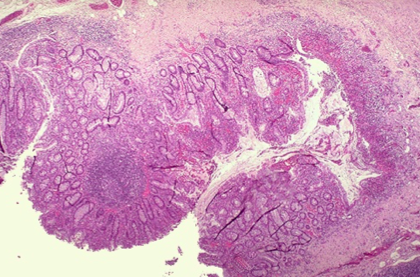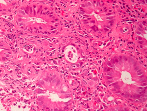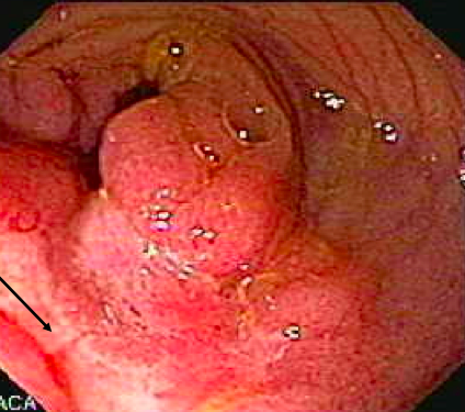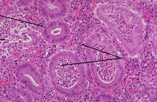 This is acute colitis in a UC patient; what else is present (arrow)?