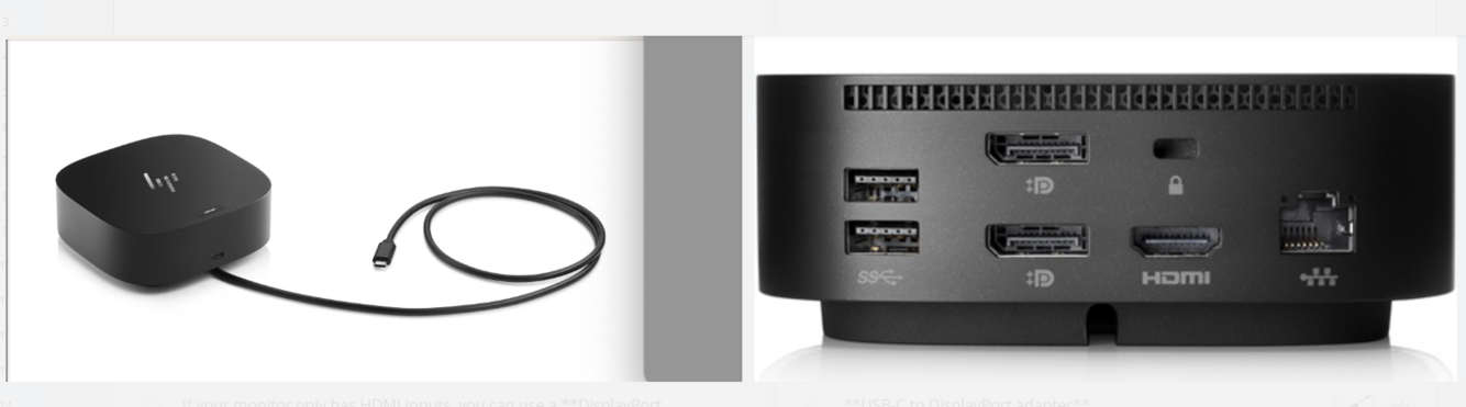 HDMI cable will plug into dock station port & the other end plugs into hdmi port on computer monitors