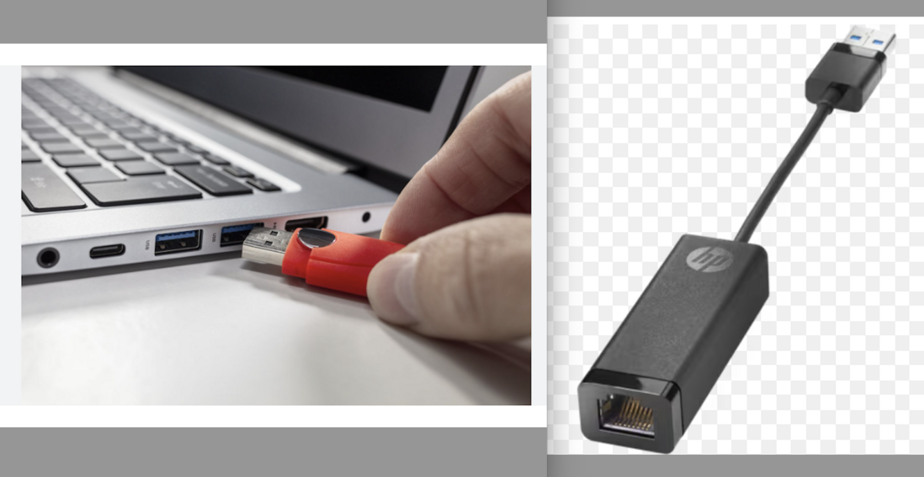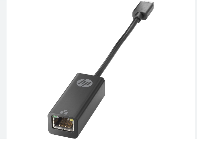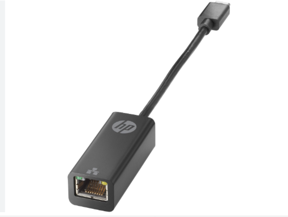 HP USB-C to RJ45 Adapter // USB-C to Ethernet adapter = plugs into one of the available USB ports on your laptop. This adapter has a USB plug on one end and an Ethernet (RJ-45) port on the other