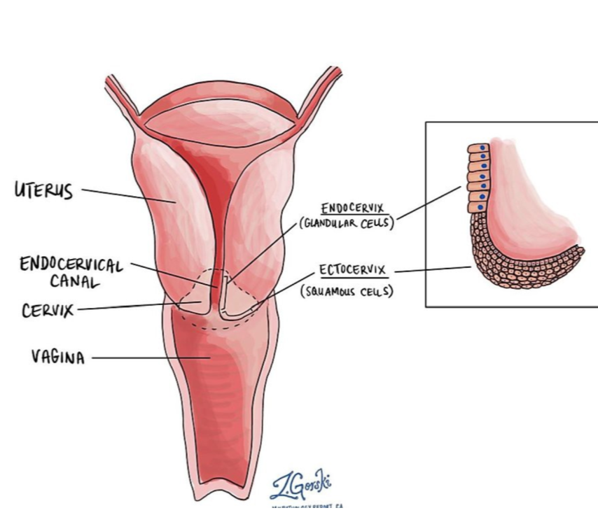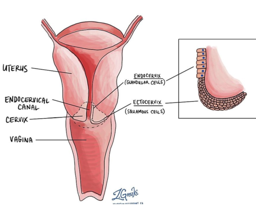 -there is an abrupt change from glandular/ columnar cells from the endocerxix to the non keratinised stratified squamous epithelium in the ectocervix